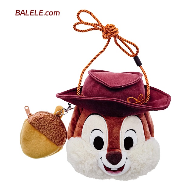 The bag is shaped like the head of Chip, the quick-witted chipmunk from Disney’s Chip ’n’ Dale. It features ultra-soft, fluffy brown fur, plush white cheek tufts, large expressive black eyes, a small brown nose, and a cheerful, wide smile that perfectly captures Chip’s energetic personality.