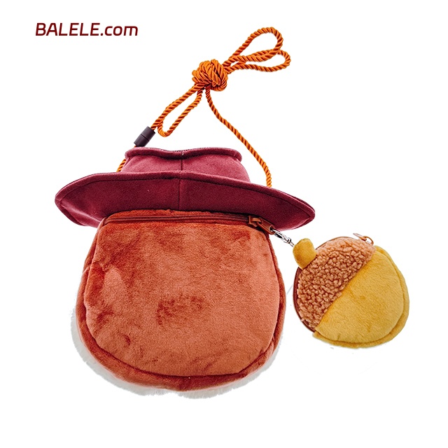 A detachable, plush acorn-shaped coin purse hangs from the main bag via a silver clasp. The acorn features soft yellow fabric for the nut and textured brown sherpa for the cap, adding a charming, functional extra storage space for small items like coins, AirPods, or lip balm.