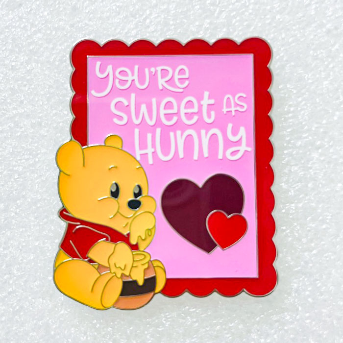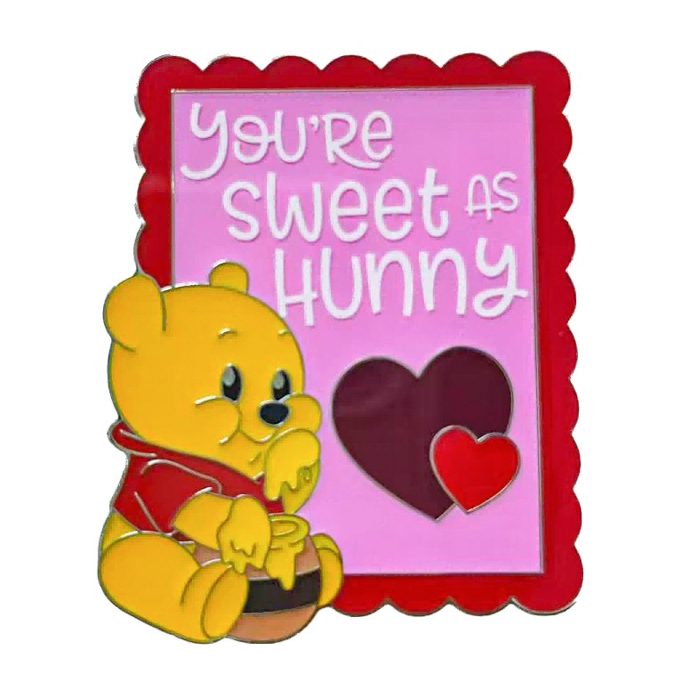 Featuring the romantic slogan “You’re sweet as Hunny” on a pink card background with red scalloped edges. Winnie the Pooh is depicted hugging a honey pot in the corner, accompanied by heart motifs, creating a warm and sweet atmosphere perfect for Valentine’s Day.