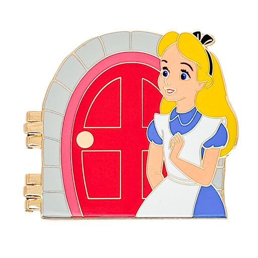 This pin features Alice and White Rabbit from Disney’s animated Alice in Wonderland. On the front of the closed pin is Alice preparing to knock on the pink door of White Rabbits house. Inside is an interior scene with Alice standing next to a rabbit shaped grandfather clock and White Rabbit who is looking at his stopwatch as he is late for a very important date.
