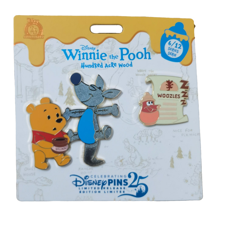 • Design: Features Pooh and Eeyore on the left, with a separate Woozle scroll pin on the right.
