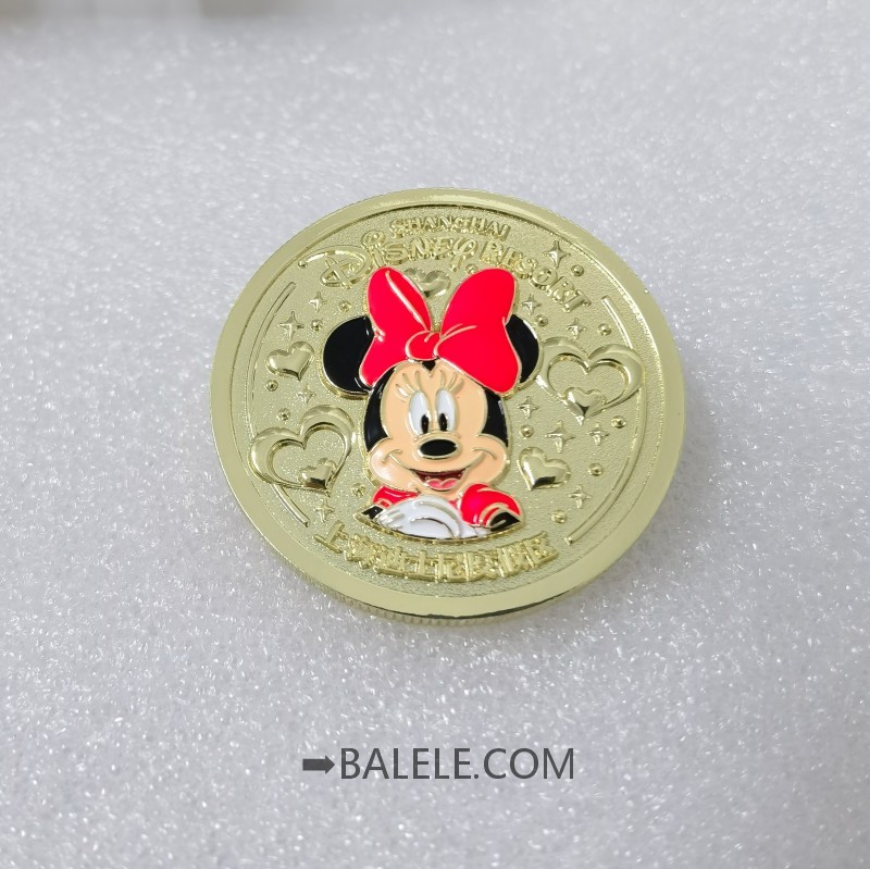 Description:This golden circular pin features Minnie Mouse with a red bow, smiling warmly. The background is decorated with hearts and stars, and the edge bears “SHANGHAI DISNEY RESORT” in English and Chinese, creating a romantic and whimsical design.