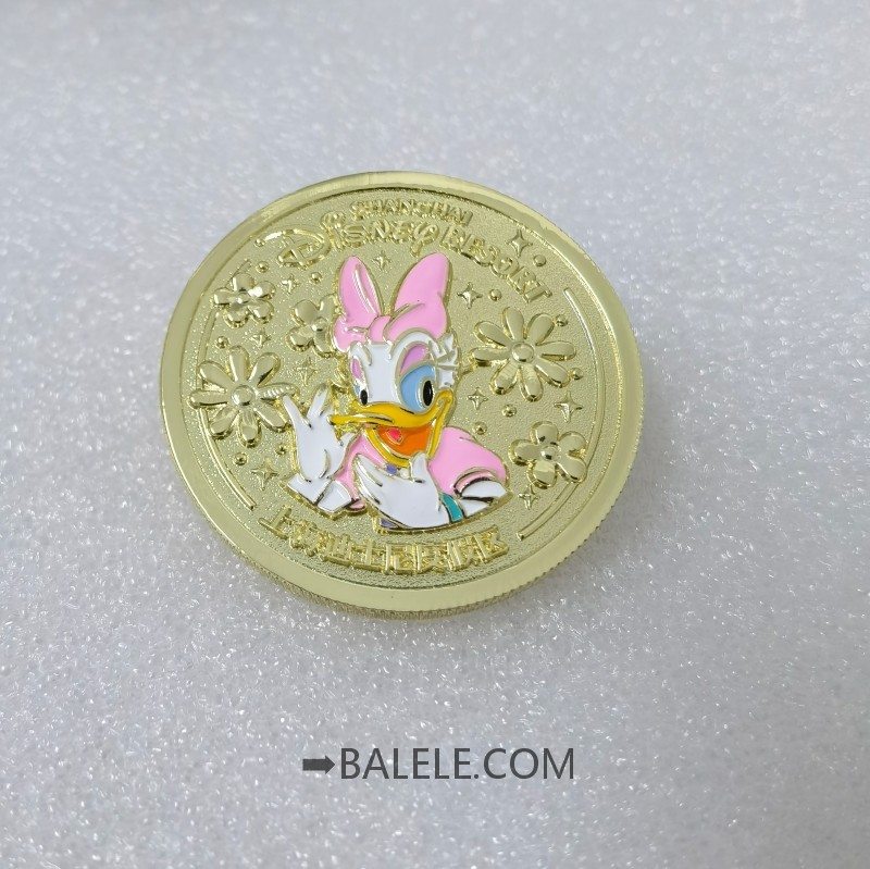 Description:This golden circular pin features Daisy Duck wearing a pink bow and dress, posing gracefully. The background is adorned with flowers and stars, and the edge displays “SHANGHAI DISNEY RESORT” in English and Chinese, creating a sweet and whimsical design.